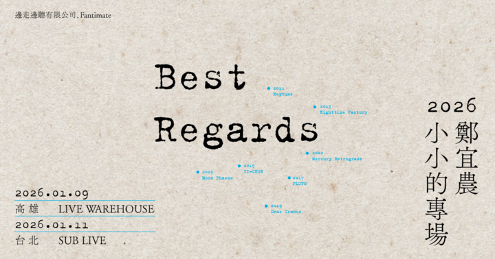 Best Regards - 鄭宜農2026小小的專場 想和這一年,參與 Space N 會員制的大家道謝。 在 2026 的起點,靜靜地、近近地, 唱些平常少見的歌。 將祝福寄給每一段即將展開的旅程。 /購票資訊/ 【活動時間與場次】 ::臺北場:: 時間|2026 年 1